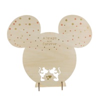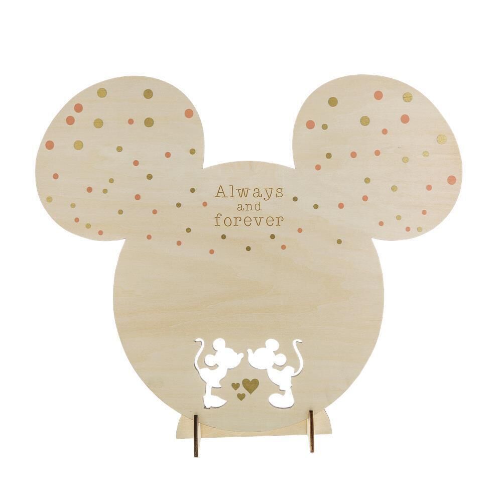 What better way to rembember your important guests than with this alternative plaque. Mickey and Minnie Mouse plaque can be used for guests to sign at any romantic occassion. Includes gold brio pen and stand so plaque can be stood up. Produced using sustainably sourced wood.
