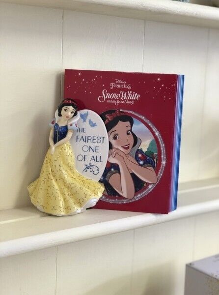 This delightful new series of flatback figurines are the perfect way to increase your collection. Flatbacked to hang on your wall or to take less room on the shelf – so you can fit more on! Snow White in her beautiful blue and yellow dress with 'Once Upon a Dream' featured on the plaque. Hand made and hand-decorated in fine bone china.