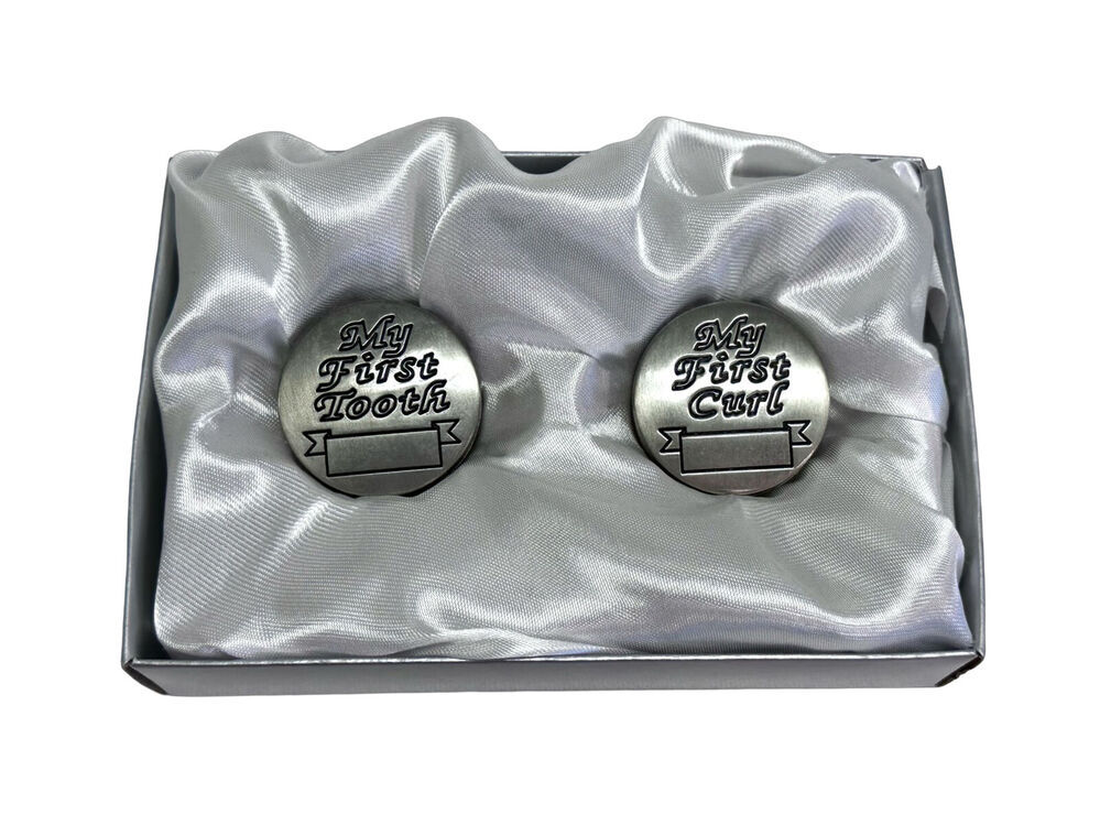 A beautiful pewter finish first tooth and curl set box with labels inscribed on each lid.