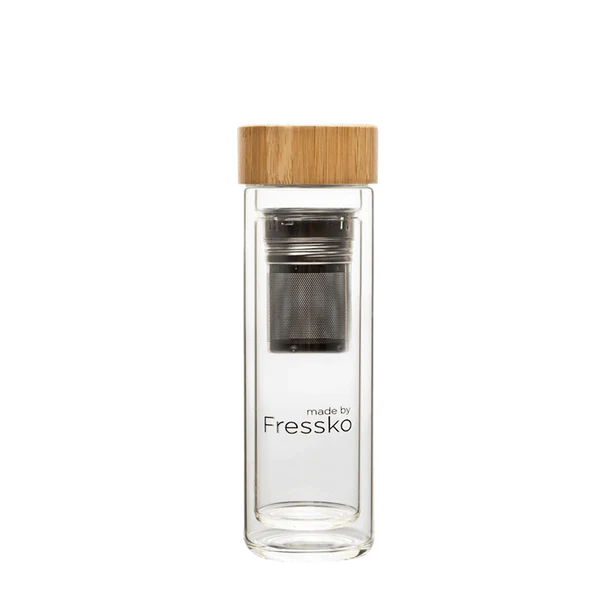 Designed for tea lovers, fruit water aficionados and smoothy sippers, Fressko's elegant double-walled, insulated glass flask with premium 2-in-1 food grade, stainless steel infuser merges quality brew-on-the-go functionality with a visually aesthetic perfection.