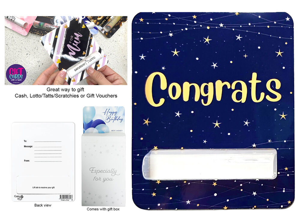 A gift card with a twist! Includes space to write who the card is to and from, and a compartment to place money or even a lottery ticket in. Comes with an envelope.