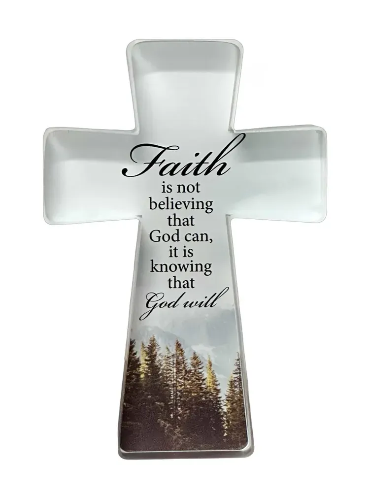 A beautiful glass cut standing cross featuring text that reads 'Faith is not believing that God can, it is knowing that God will'.