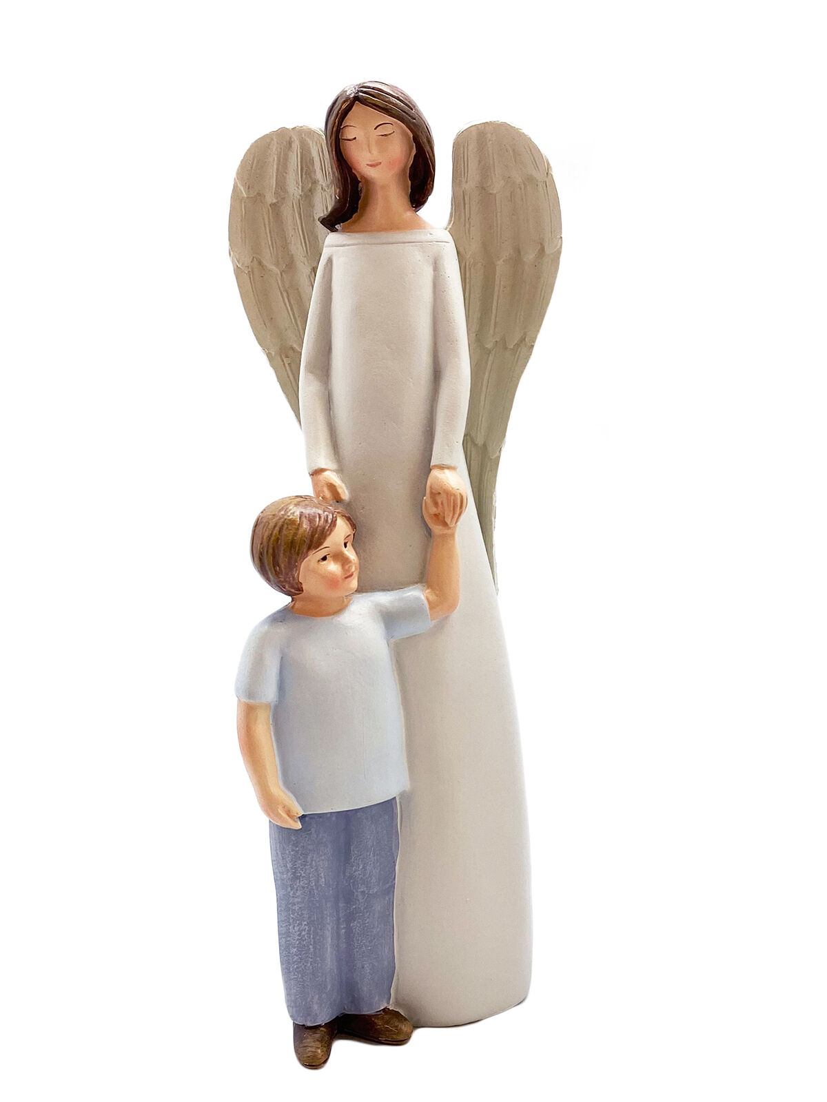 This beautiful statue would be a perfect gift for a son, brother, uncle, nephew or godson. It depicts a brown-haired angel in a white dress holding the hand of a young boy.