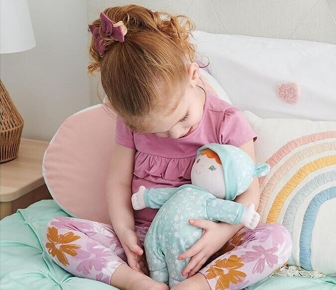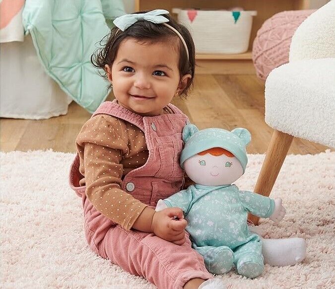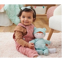 Introducing GUND's new line of baby dolls created from sustainably sourced from 100% recycled materials! Each adorable dolly friend is crafted with luxe, ultra-soft recycled plush, recycled thread including embroidery, plastic fibre fill and sustainable packaging. It's GUND's gift to future generations of cuddlers! Packaging is made from recycled materials - a paper hangtag and cord, recycled sewn in label, packaged in a post-consumer polybag. This sweet baby doll has red hair, green eyes, rosy cheeks and a sweet smile. She wears an aqua green onesie and coordinating hat and is ready for cuddles!