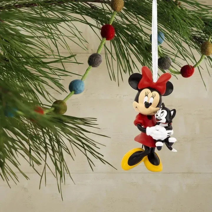 Bring a touch of sweetness to your holiday celebration with this adorable Disney Minnie Mouse Christmas tree ornament! The beloved character, festively dressed in red, holds a cute black and white kitten with a red bow around it's neck. Made of resin, this ornament is ready to hang on your Christmas tree, complete with a ribbon attachment.