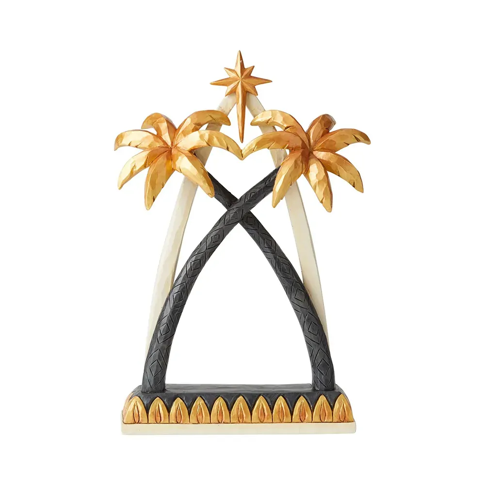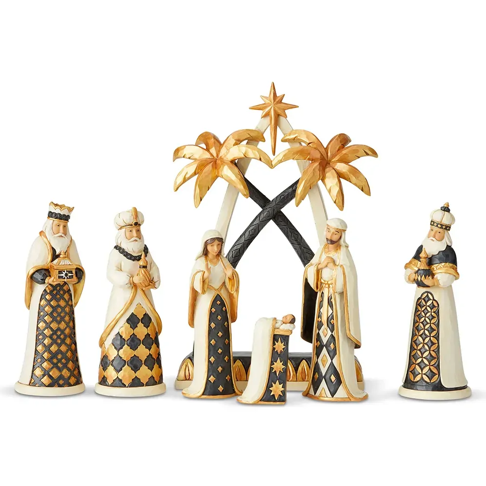 Jim Shore’s stunning Black & Gold collection features unmistakable style finished with striking, contrasting colour. This exquisite 7 piece Nativity set is decorated in delicately handcrafted detail accented with bold geometric design.