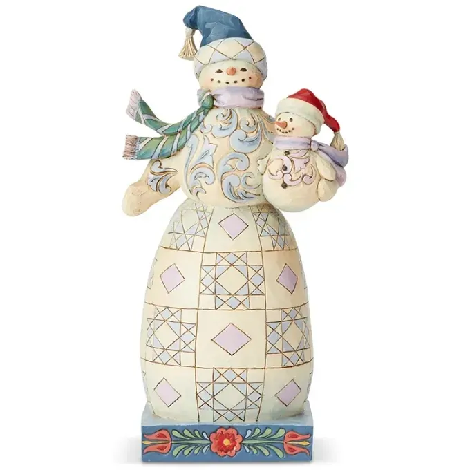 This classic Snowman with festive Snowbaby features Jim Shores signature combination traditional motifs including precise geometric patterns drawn from quilting and rich flowing designs inspired by the traditions of American folk-art.