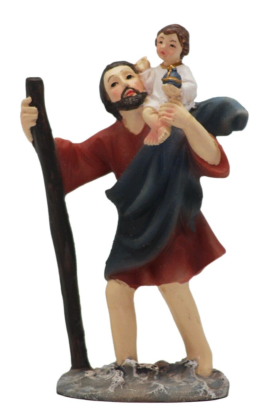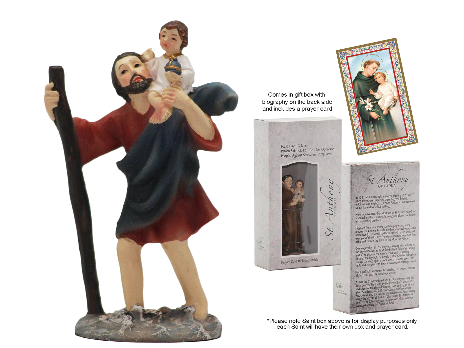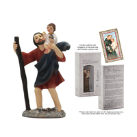 This figurine of St. Christopher comes displayed in a box with a front window, the Saint's biography on the back and a prayer card included inside.
