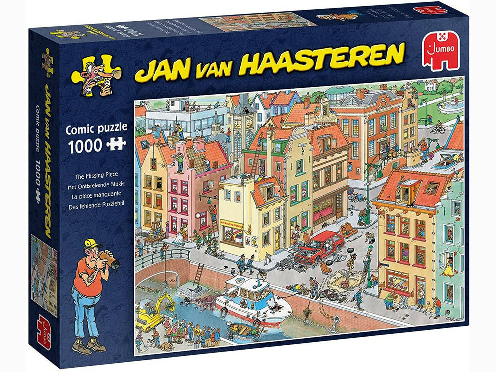 The Missing Piece' is the title of this hilarious Jan van Haasteren 1000-piece jigsaw puzzle featuring a host of humorous illustrations. The completed image shows a town being turned upside down with cars being taken apart, holes being dug in the road and tiles being taken off the tallest roofs as residents hunt for the missing piece! Puzzlers can find Jan's humour in even the smallest details of the puzzle image.
