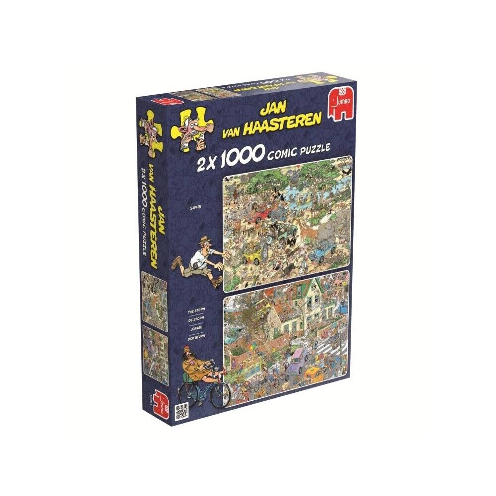 A 2 x 1000 piece puzzle box set by the famous Dutch artist - Jan van Haasteren. Both puzzles measure 68x49cm. The first puzzle depicts a chaotic safari adventure where the animals are running wild and causing all sorts of mischief to the tourists. The second puzzle depicts a chaotic street trying to weather the gale-force winds that are blowing everything and anything in its path down the street.