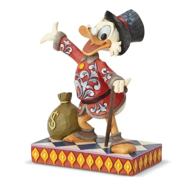Money makes this wealthy duck's world go 'round! Designed by Jim Shore, Scrooge enlists his nephews to polish his beloved fortune so he can enjoy his favorite pastime: diving through his money. Live lavishly and add Scrooge to your treasures!