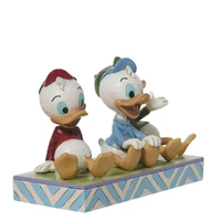 Disney's much beloved and mischievous brothers, the triplet ducklings, sit on the grass in their iconic red, green, and blue attire. Each wears a goofy grin with Jim Shore rosemaled details. Huey, Dewey, and Louie celebrate 35 years together.
