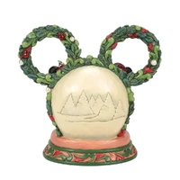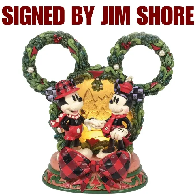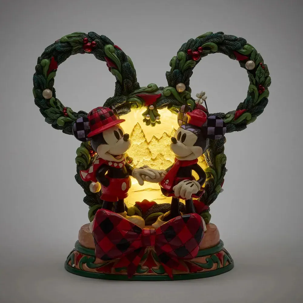 This delightful Jim Shore Christmas scene captures Mickey and Minnie holding hands beneath a glowing LED diorama, framed by a festive Mickey-shaped garland adorned with berries and pearl accents. It radiates seasonal magic with holiday charm.