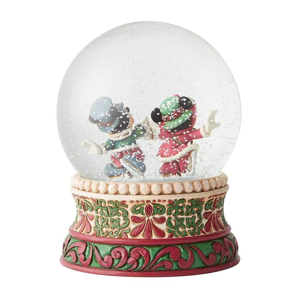 Jim Shore’s unmistakable style combines classic Disney characters with designs inspired by folk art forms of quilting, rosemaling and tole painting. Mickey and Minnie Mouse are filled with Christmas spirit as they ice skate in this Victorian inspired waterball.