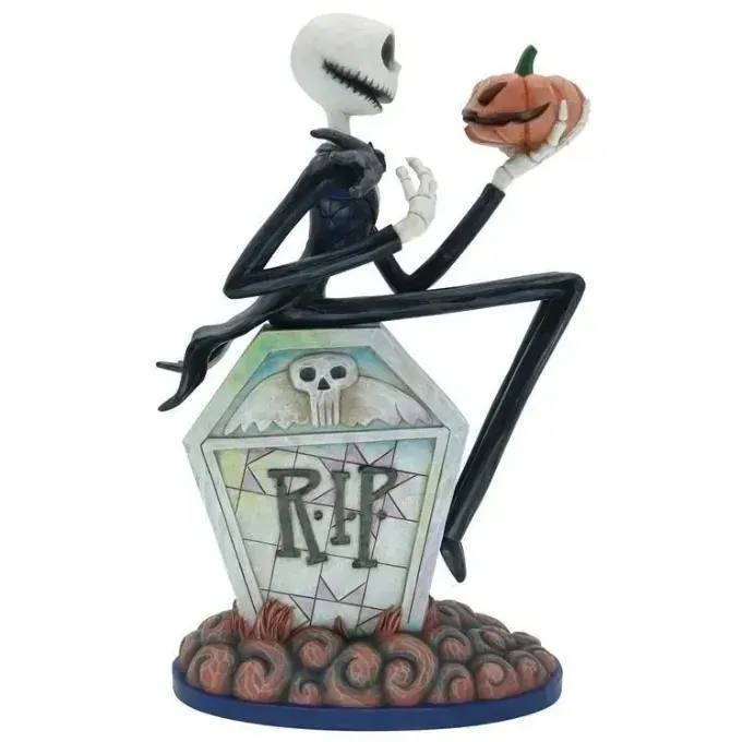 Sitting atop a tombstone, Jack Skellington has a To Be Or Not To Be moment with a jack-o-lantern. Eye to eye, he holds a pumpkin much like a skull and contemplates all things Halloween. This Jim Shore piece boasts patchwork details and endless charm.