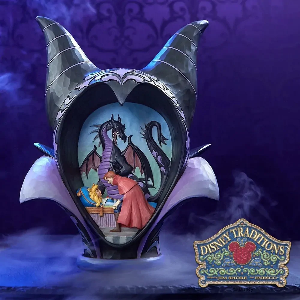 Framed within Maleficent's horned silhouette, an illustrious Sleeping Beauty scene unfolds. Prince Phillip arrives at Aurora's bedside with fairies, Flora, Fauna, and Merryweather, to break the curse before the kingdom falls in this Jim Shore creation.