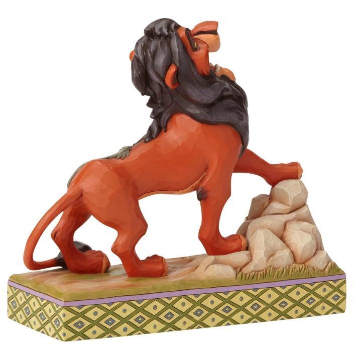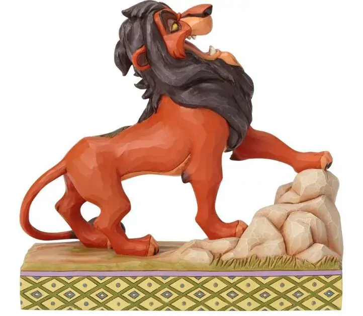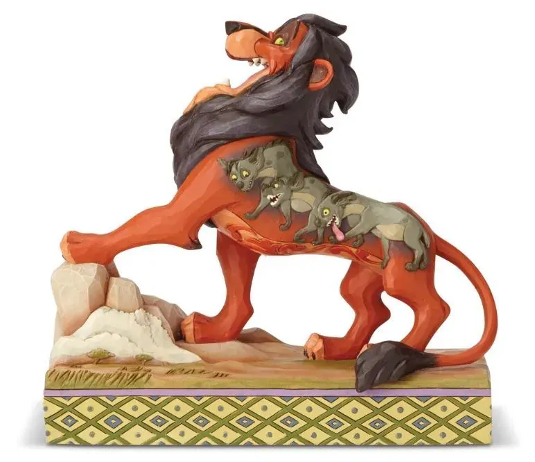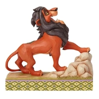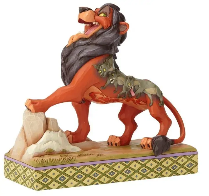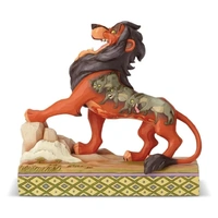 It's best to be prepared when this darkly ambitious usurper has his eyes on the throne! Designed by Jim Shore, Scar sings proudly of his villainous plot to steal the crown with details of his laughing, hyena henchmen decorating his pelt.