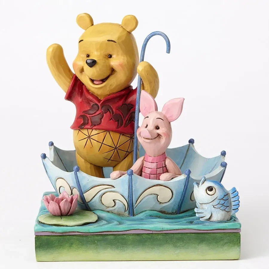 Winnie the Pooh and Piglet celebrate "50 Years of Friendship" while sharing smiles and an umbrella raft in this charming creation featuring the beloved Disney characters and the heartfelt style of folk artist Jim Shore. Made from resin. Packed in a branded gift box. Unique variations should be expected as this product is hand painted. Not a toy or children's product. Intended for adults.