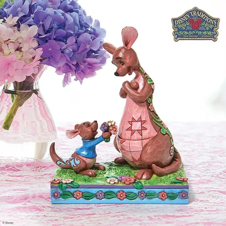 The Winnie the Pooh crew enjoy Spring in the Hundred Acre Wood. Kanga and Roo pick wild flowers in the crisp morning air. Engraved with flowers and patchwork, the Jim Shore modeled kangaroo accepts her joey's freshly picked gift with a smile.