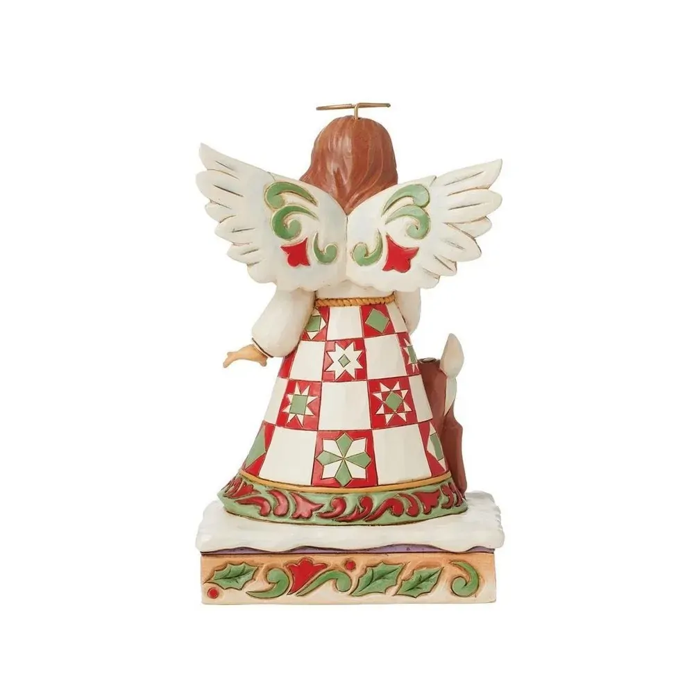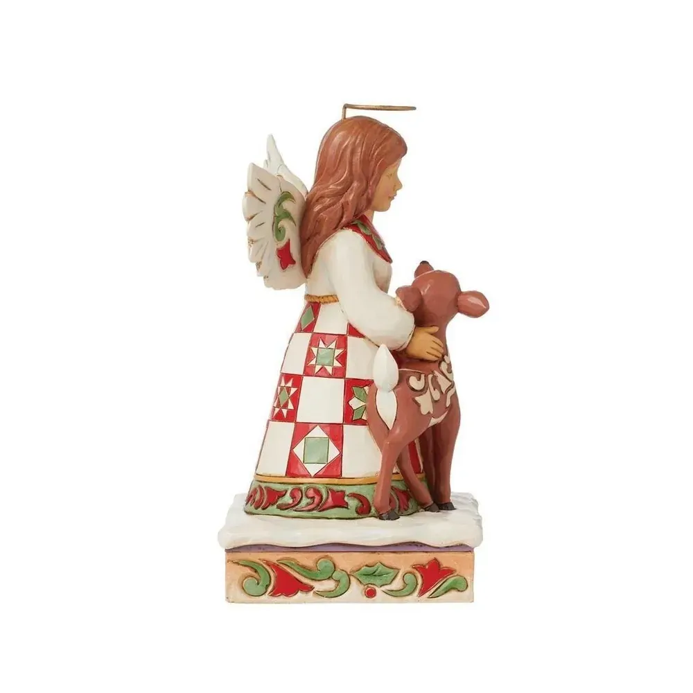 On a stage of flowers, a hallowed angel wears a red and green patchwork-patterned dress with a smile. She pats a gentle fawn with a rosemaling pattern. The sweet Jim Shore-modeled pair celebrate the simplicity of friendship and miracle of nature.