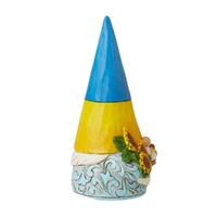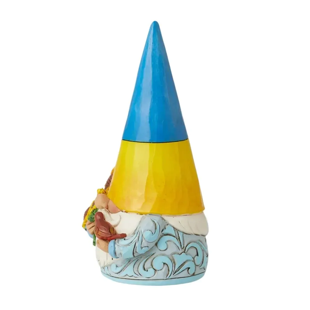 Jim Shore Gnomes Around the World collection is a whimsical celebration of symbols and customs. The Ukraine Gnome holds a Nightingale their official bird and a bouquet of sunflowers the national flower. His hat is decorated in colors of the Ukraine flag.