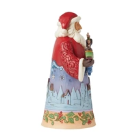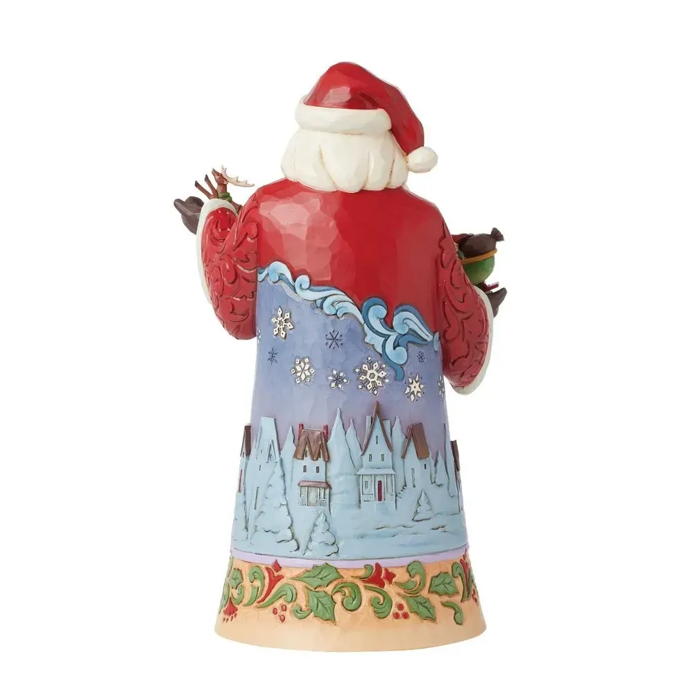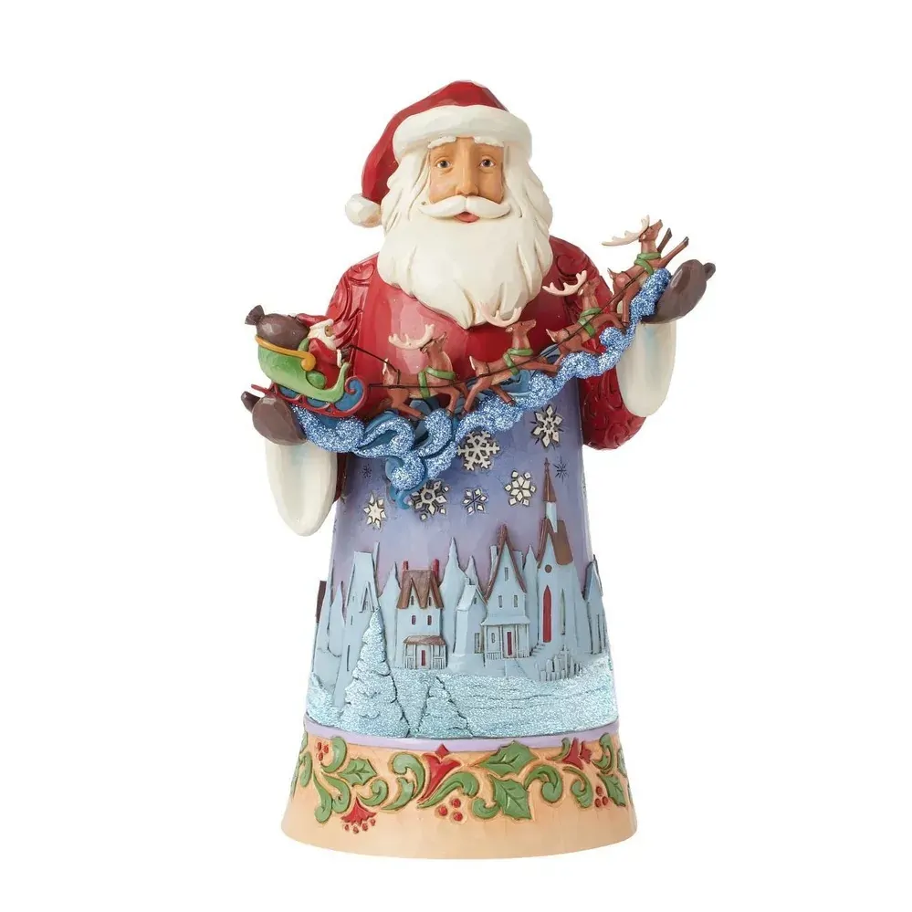 This Jim Shore Santa holds a miniature version of himself flying in his reindeer lead sleigh. With a scene of a snowy nighttime town on his robes, a scene of Christmas night is created. With rosemaling, flowers and snowflakes, this figurine enchants.