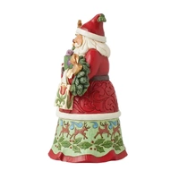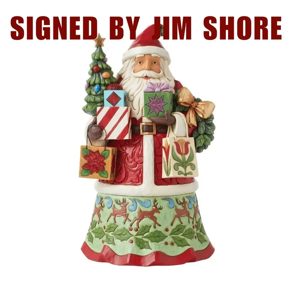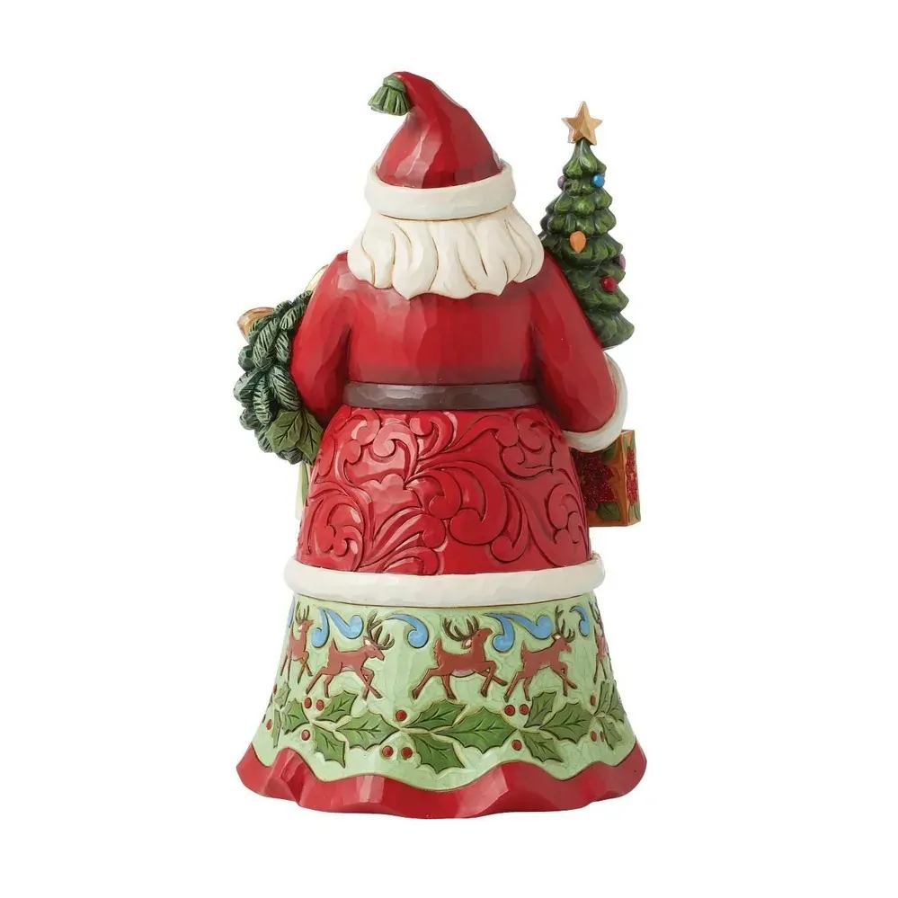 This colourful Santa by Jim Shore has his hands full with gifts! Holding a wreath, miniature Christmas tree, gift bags, boxes and ornaments, this intricate Santa smiles with a tasseled hat. Santa's cloaks are patterned with rosemaling and reindeers.