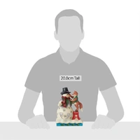 This charming Snowman and Fox are the 6th Annual "Snowman and Friends" statuette in the Jim Shore collection. Using a step stool, a green-vested fox adjusts his snowman friend's carrot nose with care. Smiling together, friendships keep winter warm.