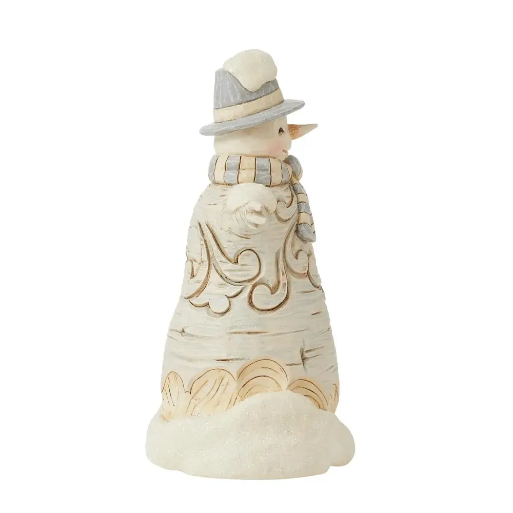 This adorable little snowman boasts rosy cheeks and a smile this season. With a top hat heavy with snow and striped scarf, this rosemaling-accented snowman brings additional warmth to your holiday home decor. Celebrate winter in the White Woodland with Jim Shore!