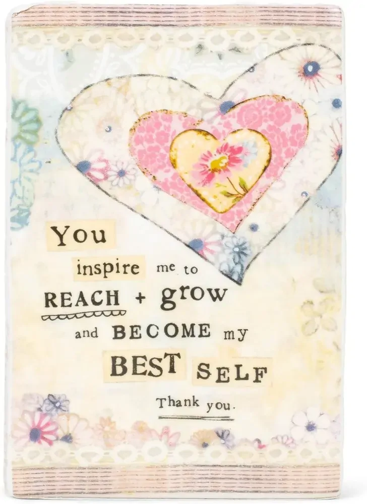 Touch their heart and nurture their strengths with inspirational gifts by artist Kelly Rae Roberts. Her Best Self Plaque features hearts on a floral and lacy pattern and the message "You inspire me to reach & grow and become my best self. Thank you." Beautiful and whimsical, this stoneware plaque will match any woman's taste. The colors are varied, subdued, but largely pink, making a lovely addition to many color schemes. This is the perfect inspirational quotes plaque when you want to make sure someone knows how appreciative you are of their wonderful support, whether their support has been particularly needed lately, they need to be reassured of their value, or you want to tell them for the first time. This plaque is especially great for anyone who loves unique artisan gifts. Purchase the Best Self plaque for difficult times, holidays, or just because.