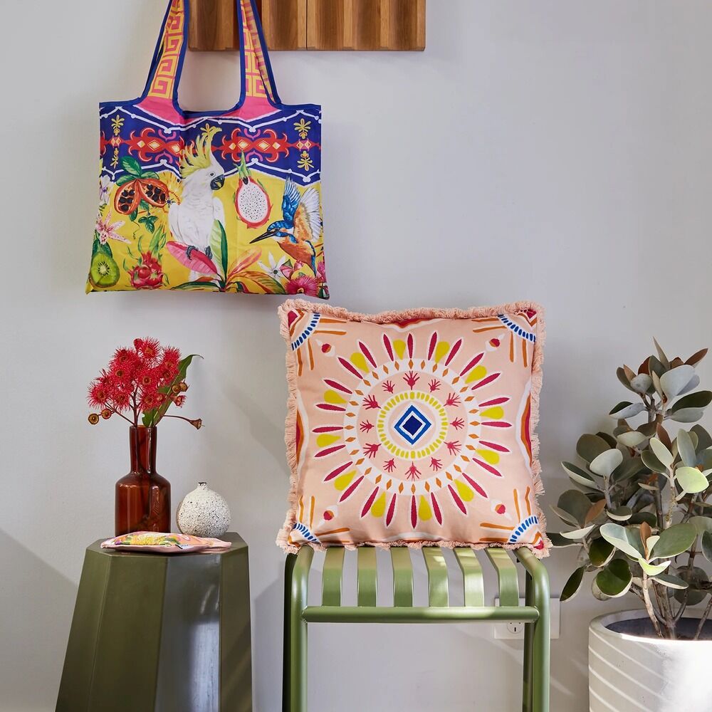 This 45cm x 45cm cushion is finished with peach fringe trim, and includes a plush polyster insert, completed with a zipper for easy removal for cleaning.