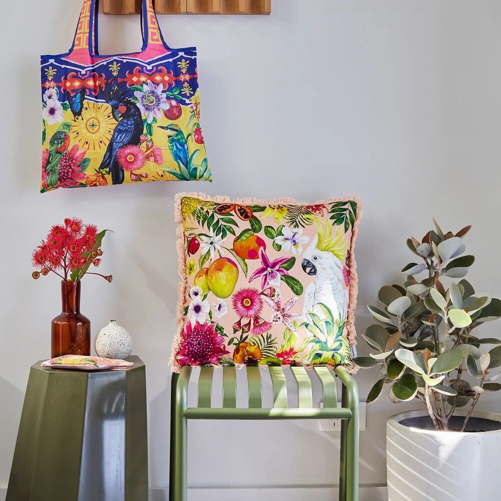The Tropicana Australiana Vol. 3 45cm cushion features two original artworks by La La Land artist Murilo Manzini, printed on white cotton, one on each side, showcasing tropical Australian native birds, and contrasting bold patterns.