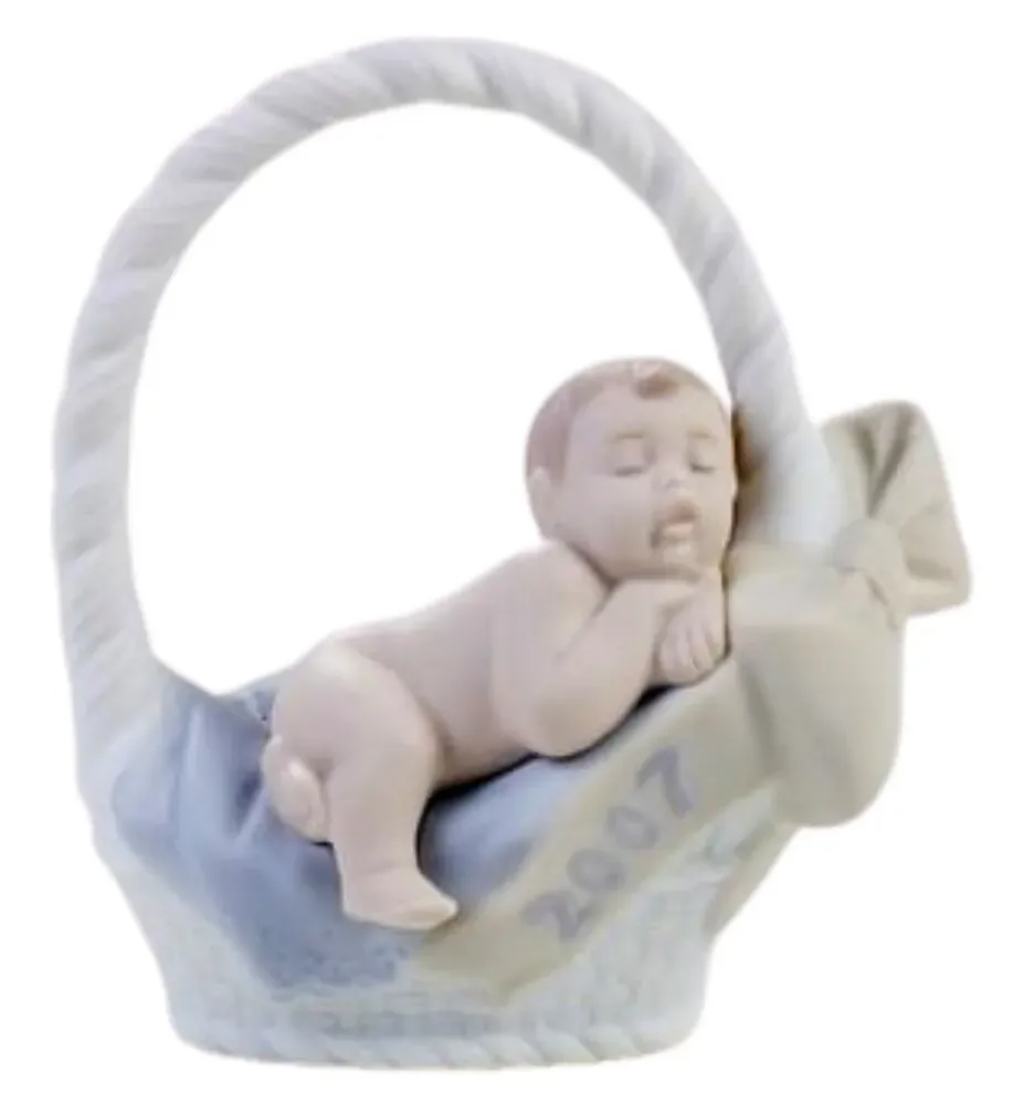 It's delicate design makes an ideal addition to your Christmas tree or a thoughtful gift for male relatives that were born in 2007. Made from high-quality porcelain, this Lladro ornament is a testament to the brand's commitment to excellence. The skilled artisans at Lladro have meticulously crafted every detail, from the pastel blue accents to the intricate carving of the baby resting on the white woven basket. The result is a stunning piece of art that will be treasured for years to come. Whether you are a seasoned Lladro collector or a newcomer to the world of Lladro, this Christmas ornament is a must-have addition to your collection.