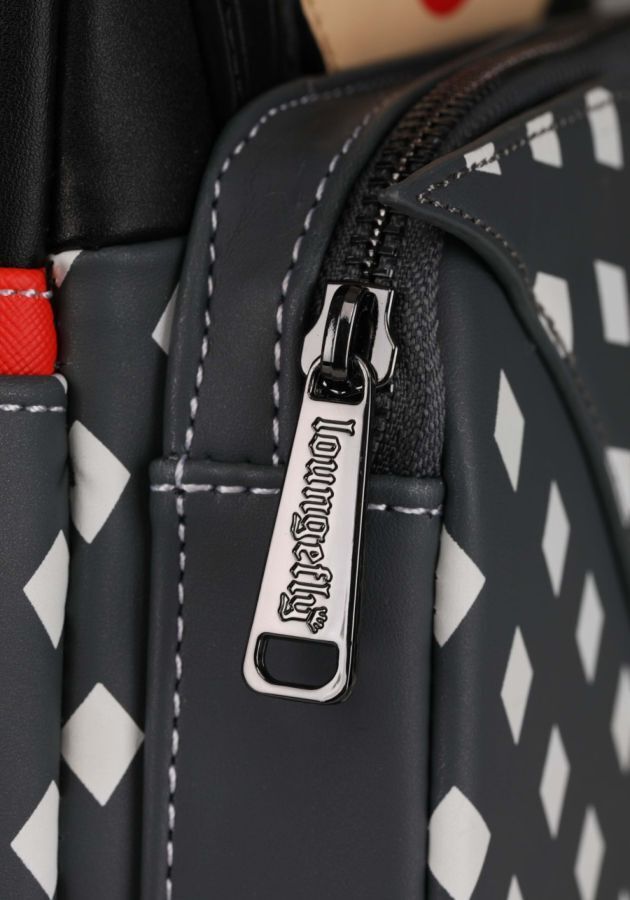 The Other Mother is constructed of vegan-friendly leather and features appliqued pieces to bring her to life! Her button eyes peer eerily from above the front pocket, which is made to resemble her dress worn as she reveals her terrible, final form. On the back, you'll find printed details of the key to the other world.
