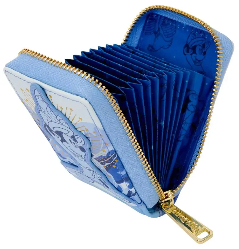 A magical way to show off your love for Disney every day! This wallet features Sorcerer Mickey on the front putting on his sorcerer hat! Gold foil stars appear behind him. Turn the wallet around to find another image of Mickey's sorcerer hat above the words "Disney Fantasia." Take a look inside to find accordion-style card slots to carry your essentials! It's the perfect Disney flourish for your day!