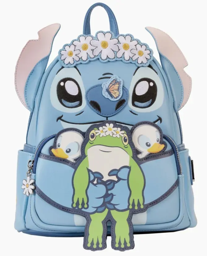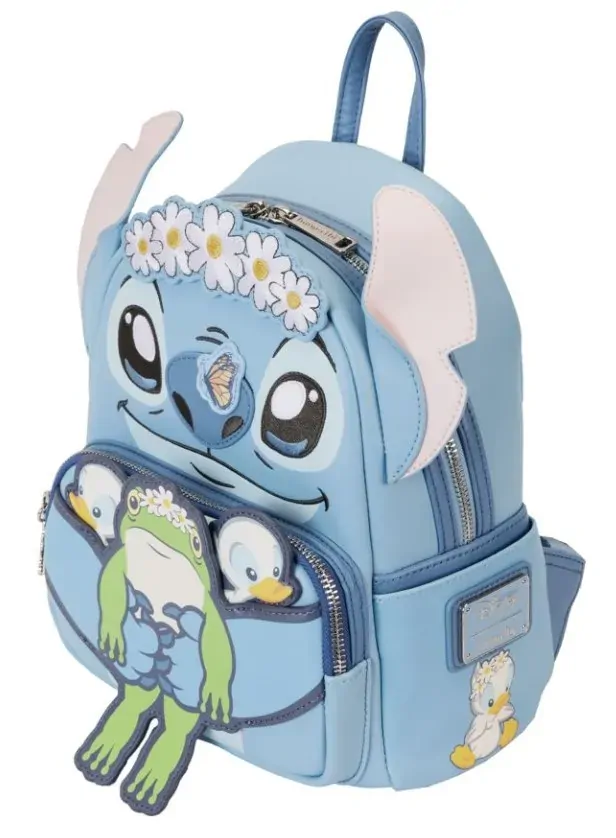 New beginnings are in bloom! Embrace a season of fresh starts with the Loungefly Lilo & Stitch Springtime Stitch Cosplay Mini Backpack. This accessory takes the shape of the loveable alien as he makes flower crowns for all his friends. Wearing a daisy crown, embroidered details highlight Stitch's facial features as a butterfly rests on his nose. Down below, Stitch holds a frog and ducklings on the front zipper pocket. An enamel daisy zipper charm completes the scene. Turn the bag around to see the ducklings in their crowns on the bag's side pockets while the frog appears on the bag's back. This mini backpack has plenty of room to carry your belongings and makes an adorable companion to any outing with friends.