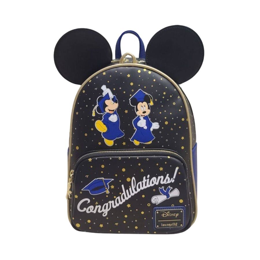Covered in gold foil confetti, this design is always ready to celebrate your dedication to education! Mickey and Minnie are right there with you, accepting their diplomas in their graduation robes with glee. It’s hats off to your hard work on the congratulatory front pocket, which is accessible with a golden diploma-shaped zipper charm. Mouse ears on top of the backpack add iconic Disney flair and a golden faux leather loop is included for you to add your own! Perhaps a tassel to match your graduate hat? A special keychain? The choice is yours!