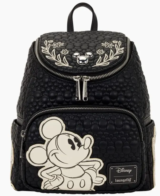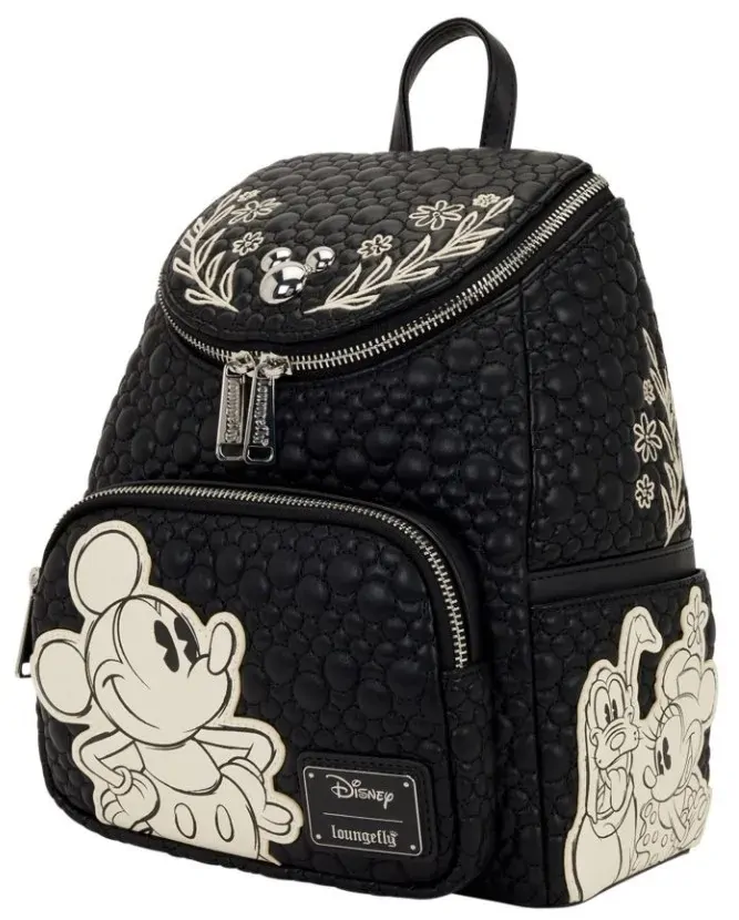 A super cute, new Disney Mickey & Friends style has just been drawn up! This mini backpack features Mickey & Friends "sketched" on the bag against a quilted Mickey-silhouette background. You'll find Mickey on the front pocket while Minnie, Pluto, Goofy, and Donald are on the side pockets! On the top flap of the bag, you'll find a metal charm in the shape of a Mickey head surrounded on either side by embroidered leaves and flowers! This bag definitely goes with any outfit and is ready to be the companion of any Disney fan!