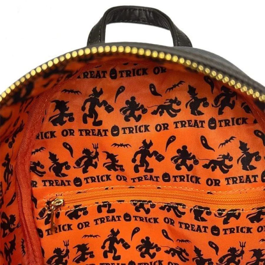 On the front of this bag, Vampire Mickey comes to life as custom-shaped applique with printed and embroidered details! Donning a dashing red bow tie, Mickey looms over a glow in the dark jack-o-lantern, which doubles as an extra storage compartment complete with a Mickey bat-shaped zipper charm! On the back, silhouettes of Mickey bats take flight.