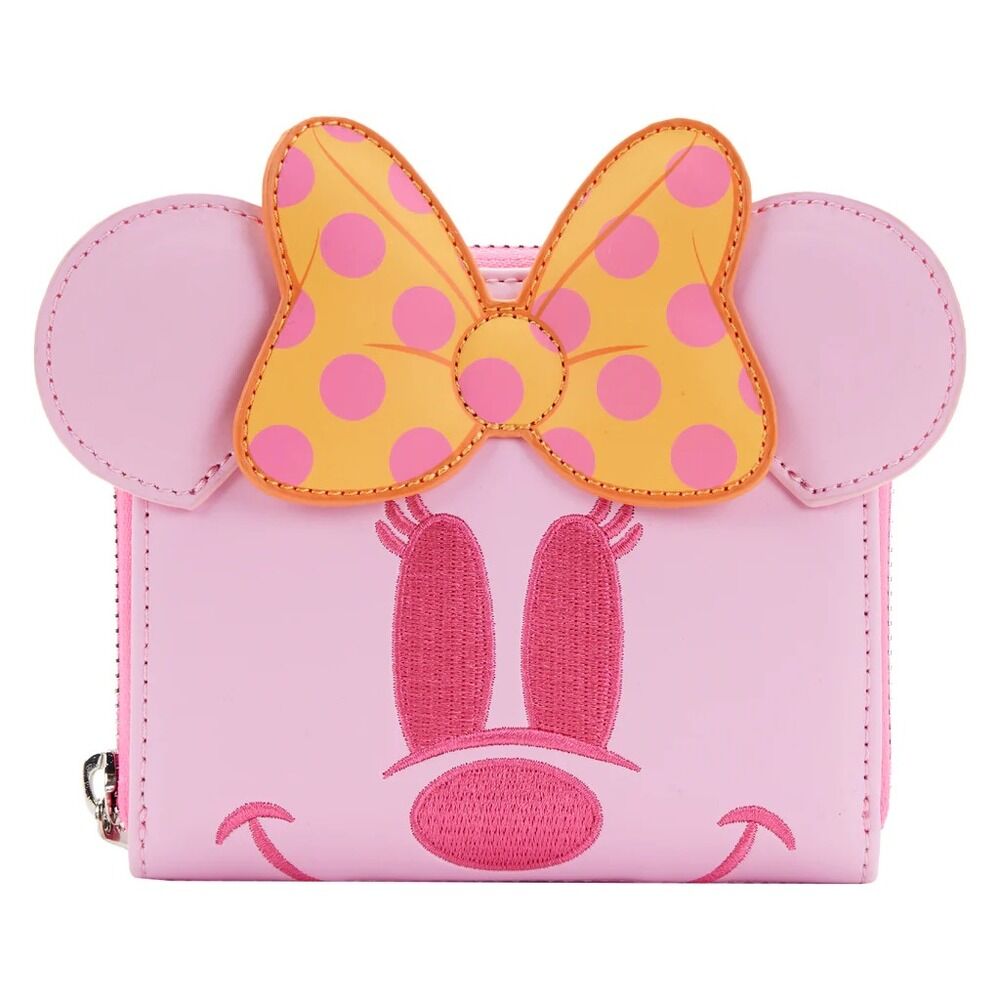 Boo-tiful adventures await with this Loungefly Disney Pastel Ghost Minnie Mouse Glow-in-the-Dark Zip Around Wallet. Keep your valuables safe on any spirited trip with this bifold wallet. On the front, applique details bring Minnie Mouse, as a pink ghost, to life. Her otherworldly ears stick up over the top of the wallet, and an orange bow, sprinkled with pink polka dots, adds a terrific twist to Minnie Mouses classic look. Turn out the lights, and Ghost Minnie Mouse glows in a glorious green color. Inside, youll find 4 slots for holding cards and 1 clear slot for holding your ID. A die-cut shape of Minnie Mouses ears is an extra special treat. Its the perfect accessory to take for a ghost touror for visiting any of your daily haunts.