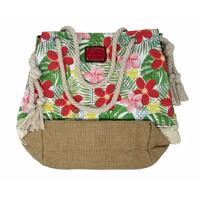 Canvas, Burlap bag with printed and embroidered details, braided rope handles.