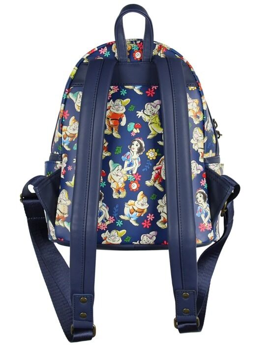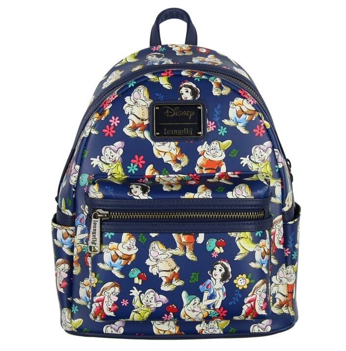 This vegan-friendly leather backpack is decorated with Doc, Happy, Grumpy, Sneezy, Dopey, Bashful, Sleepy and Snow White herself in beautiful, watercolor-esque illustration. Elements of the forest also appear, from whimsical spotted mushrooms to pretty flowers and foliage. Featuring antique brass-toned hardware, an enamel brand badge, adjustable shoulder straps and a floral-woodsy interior lining, this colorful mini backpack is something all Disney fans can dig, dig, dig!