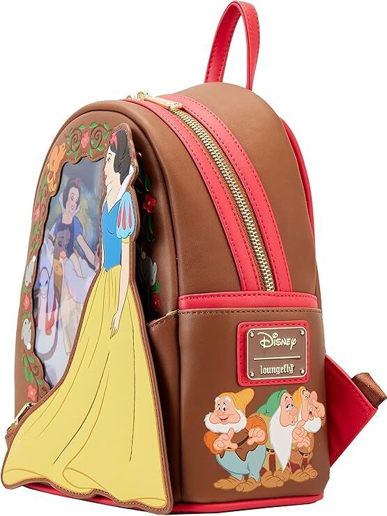 The Loungefly Disney Snow White Lenticular Princess Series Mini Backpack is made of vegan leather (polyurethane). Bag has adjustable shoulder straps, side pockets, and shiny gold-colored metal hardware. Additional features include applique, debossed, lenticular, and printed details. Take note of the coordinating inside lining.