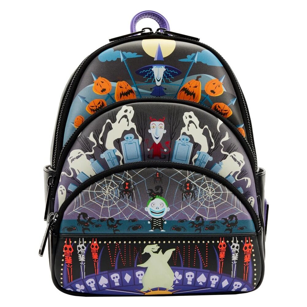 Oogie Boogie has sent his finest trick-or-treaters to carry out his dastardly plans. Stay on his good side, or he may send his mischievous henchmen after you! The Loungefly Nightmare Before Christmas Glow Triple Pocket Lock, Shock, and Barrel Oogie Boogie Mini Backpack features Oogie Boogie as he spins on a roulette wheel. Up above, Lock, Shock, and Barrel can be found lurking in some spooky hideaways of Halloween Town. Turn the bag around to find Oogie’s dice, waiting to decide your fate! This frightfully fun accessory glows in the dark and has plenty of room for storing your tricks and treats.