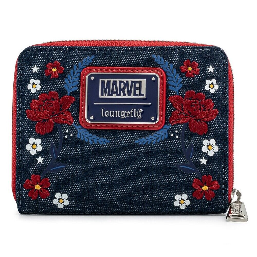 The Marvel Captain America 80th Anniversary Floral Shield Zip Around Wallet is made of denim. Wallet zips closed, has sturdy metal hardware, and features: chenille applique, embroidered, and printed details. Take note of the coordinating pattern of the inside lining fabric.