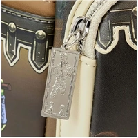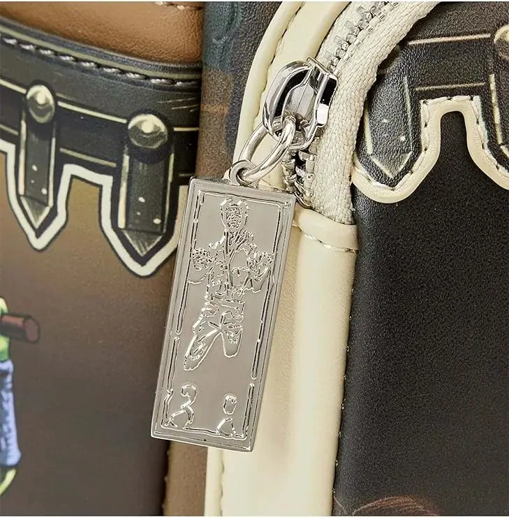 Brave the terrors of Jabba's Palace and carry your bounty out with the Loungefly Star Wars: Return Of The Jedi Jabba's Palace Mini Backpack. This 40th Anniversary edition design captures an iconic cinematic scene from the third film in the Skywalker saga. On the front, in printed and debossed detail, is Jabba the Hutt along with his entourage above the Rancor pit where Luke Skywalker has been tossed. A metal Han in Carbonite zipper charm is the closure of the front pocket. Turn the bag around to find several more of Jabba's minions. This galactic accessory makes a stellar addition to any outfit and is sure to elevate any Star Wars collection.