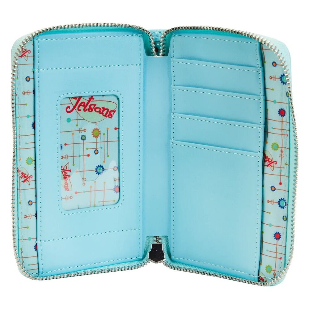The Loungefly Warner Bros. The Jetsons Spaceship Zip Around Wallet is made of vegan leather (polyurethane). Wallet zips closed and has shiny silver hardware. Additional features include applique, clear PVC, print, debossed, and applique details. Take note of the coordinating inside lining.