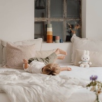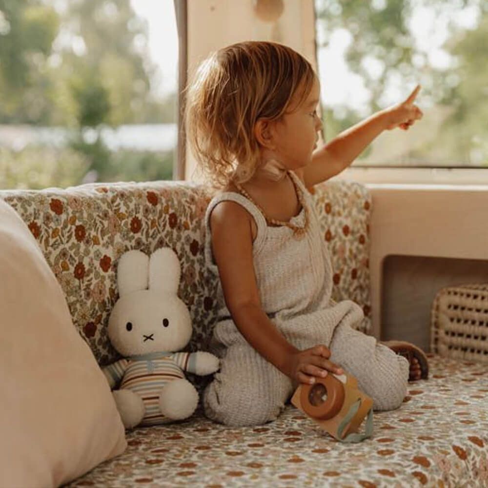 Miffy is made from soft plush and stands at 25cm tall. The beautiful new outfit of this famous little bunny is decorated with Vintage Stripes, designed by Little Dutch. A great look for the nursery!