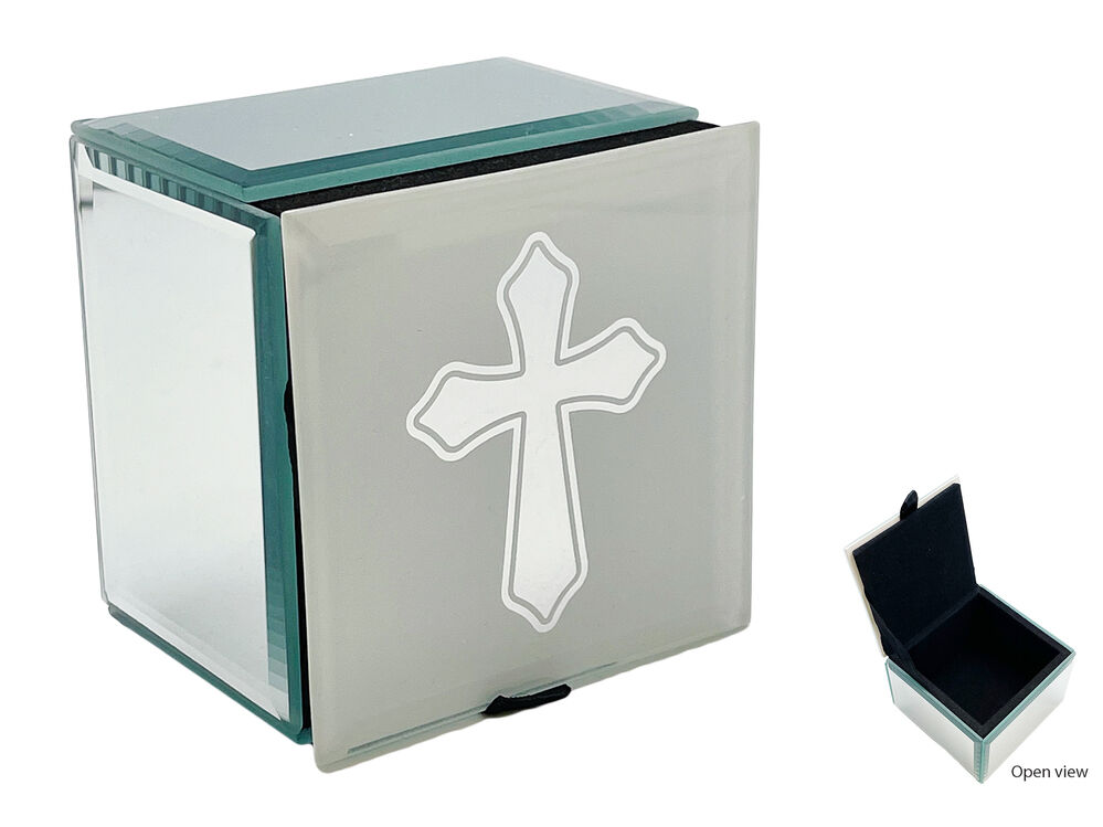 This elegant trinket box features mirrored side and a printed lid, featuring a lovely cross.