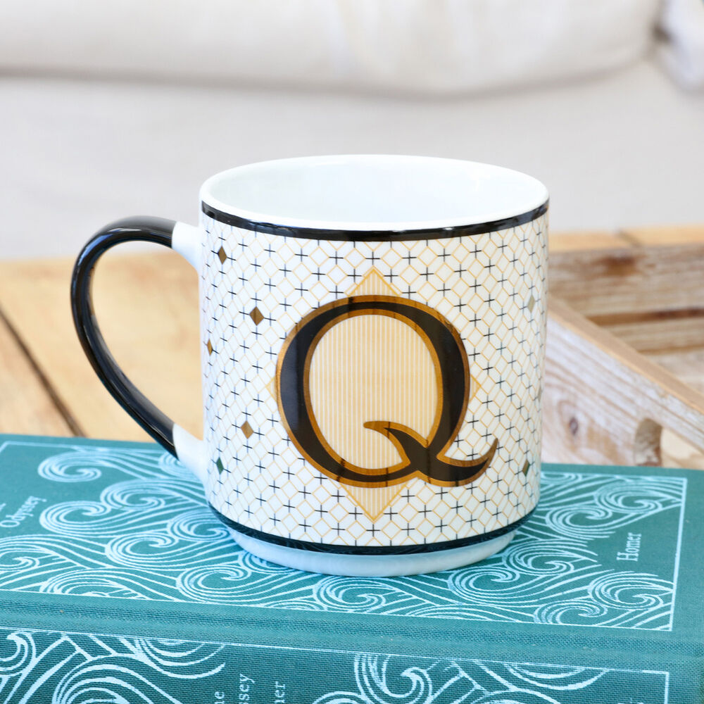 Vintage-inspired ceramic mug with gold foil detailing that features the letter Q.